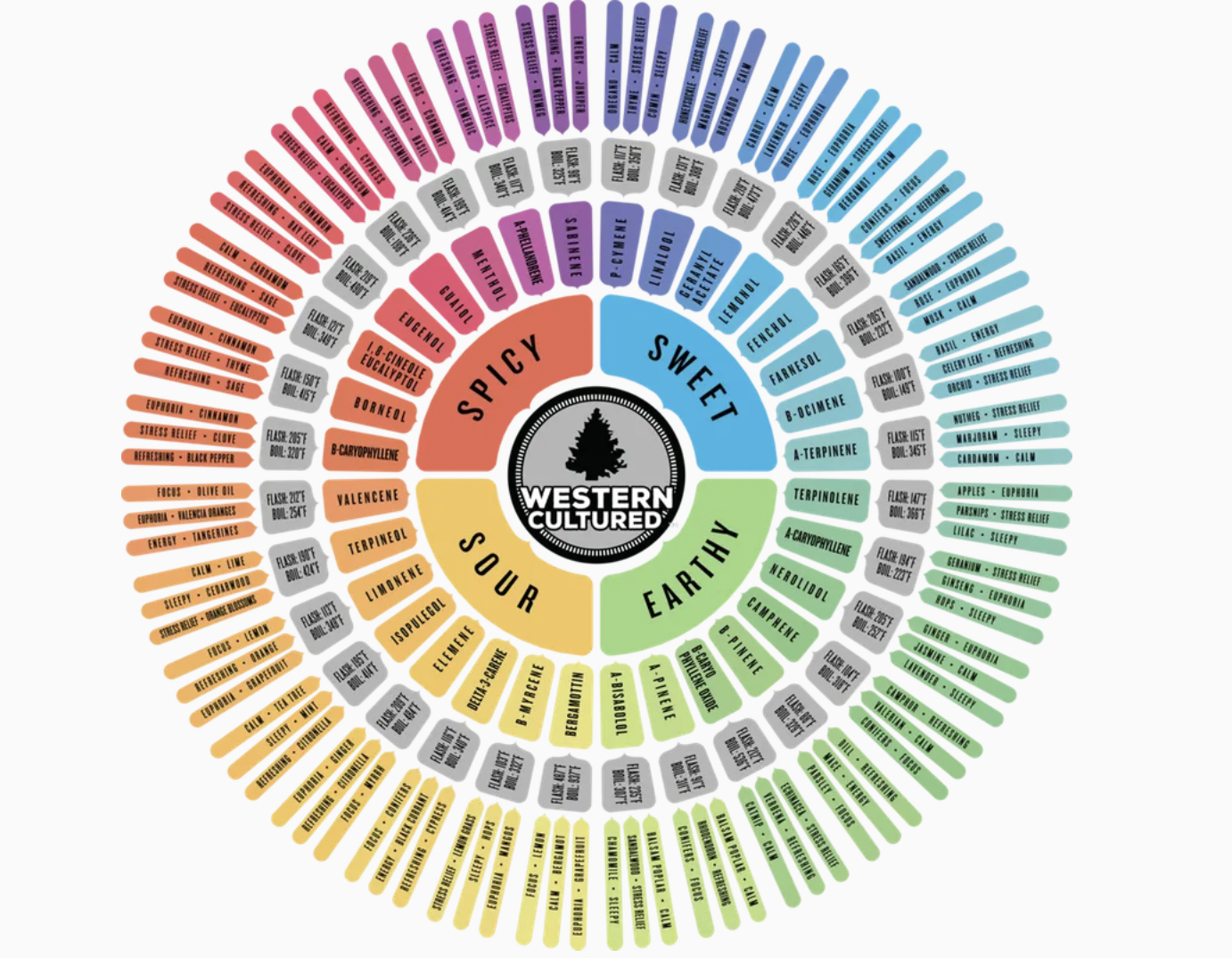 Terpenes are the chemicals in plants that give taste and smell. They are what makes different strains of cannabis smell and taste so different from each other. You’ll recognize most flavors as being present in other herbs and fruits we use on a regular basis. They can also have some influence on effect, and many believe that the combination of terpenes with cannabinoids in cannabis (sometimes called the entourage effect) is what makes it so therapeutic. Below is a graphic that goes over the taste/smell profiles of the most prevalent terpenes as well as the effects they can create.